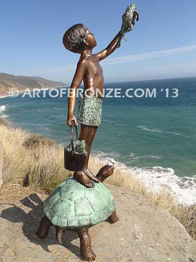 Art of Bronze brings this delightful scene of a young boy standing atop a tortoise playing with his pet frog.  Your landscape will come alive with the exceptional detail in his hair, fingers and clothing.  He stands balanced on the turtle looking above at the bullfrog he as clutched in his left arm, while his left arm holds a bucket of captured frogs with their heads peeking out.