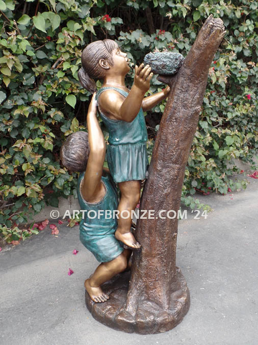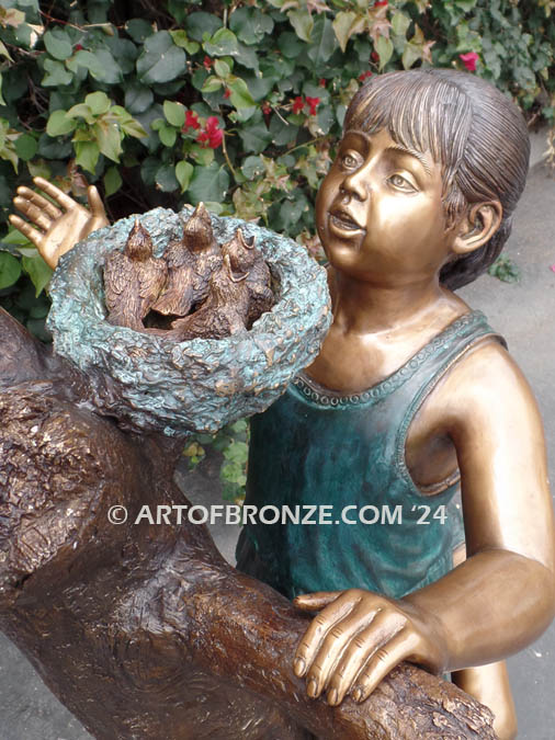 Call Art of Bronze today at (805) 908-5355 to learn more about our- outdoor bronze children’s statues – kids playing on tree bronze statue – life-size boy and girl rescuing baby birds bronze statue- outdoor children climbing tree sculptures – bronze children artwork.