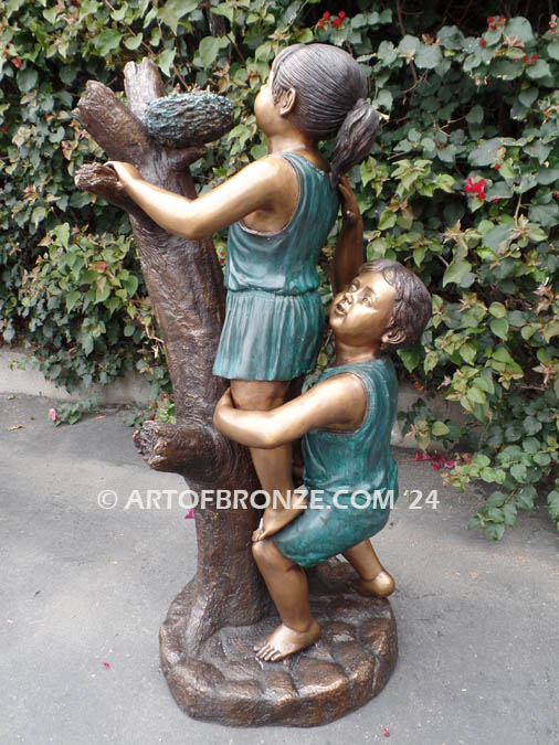 Art of Bronze is pleased to offer this beautiful bronze statue of a young boy helping his sister peek inside the bird nest attached atop the branch. These two kids are checking up on the chirping sounds of baby birds to see if they are ‘ok’ or need of a rescue. What an incredible adventure they are having. You too can enjoy this adventure everyday as you view them in your yard, garden or courtyard. This bronze statue is suitable in any garden setting, park, playground, front or backyard.