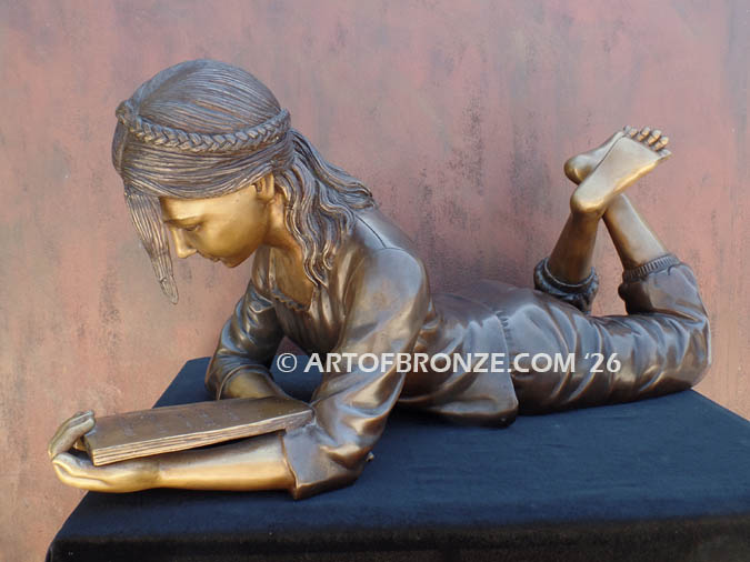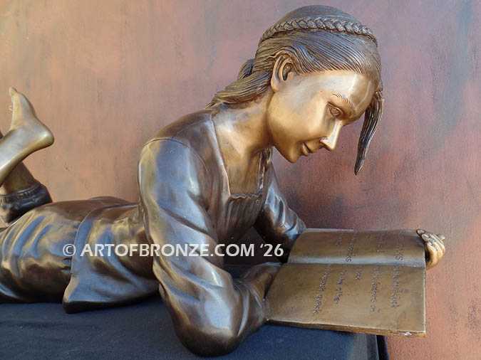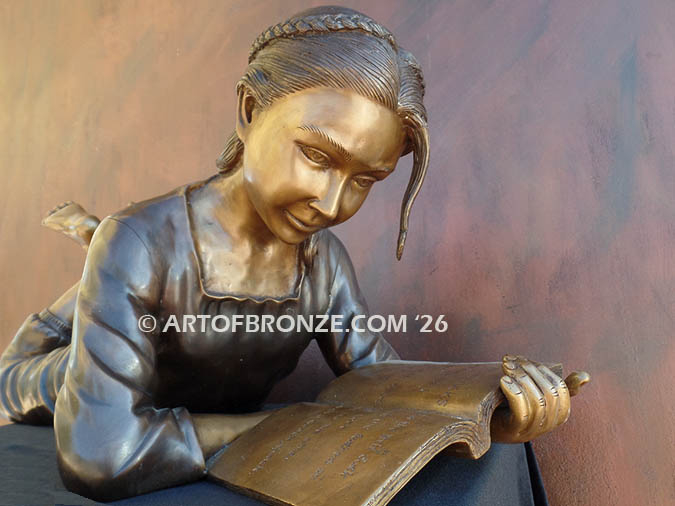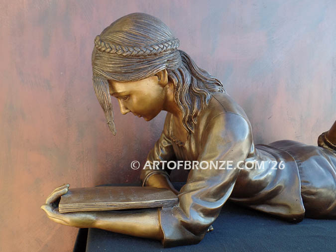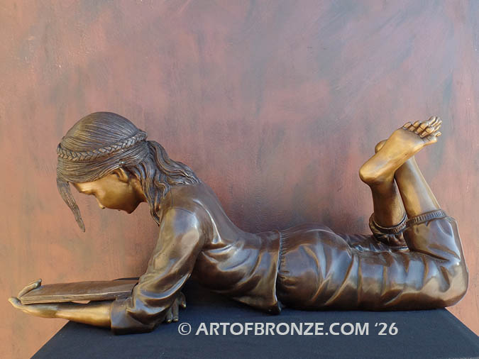 Art of Bronze is proud to offer this bronze sculpture of a young girl lying down enthralled in her favorite novel. She is the perfect inspiration for children reading. Incredible detailing can be found in her hair, clothes, fingers and toes. Enjoy this smaller version which measures 27″ in length either inside or outside your home.