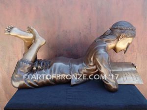 Art of Bronze is proud to offer this bronze statue of a young girl lying down reading her favorite book.  Incredible detailing can be found in her hair, clothes, fingers and toes.  Enjoy this smaller version which measures 27″ in length either inside or outside your home. Call Art of Bronze at (805) 908-5355 to speak with a consultant today.