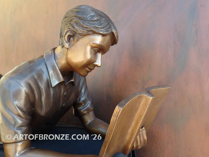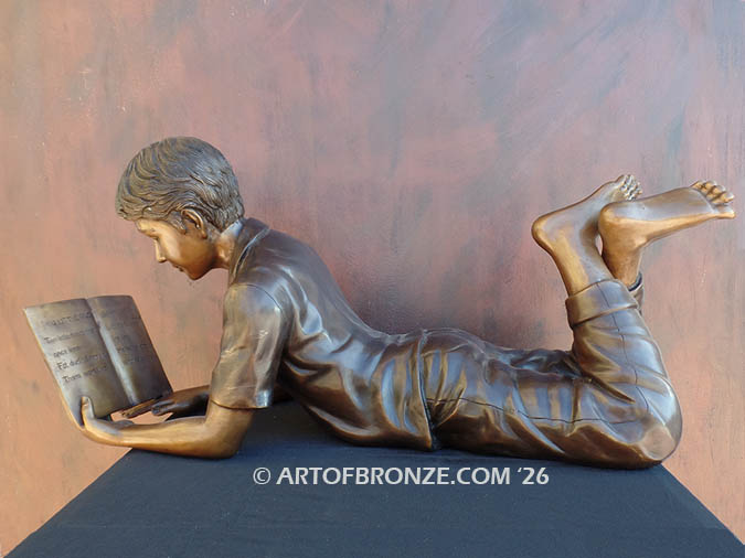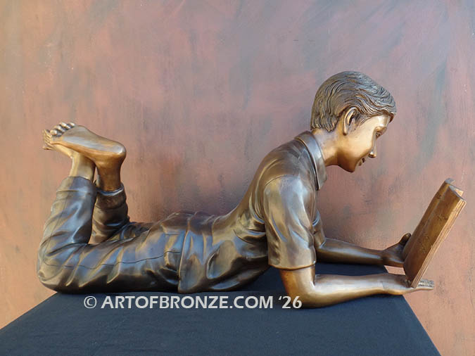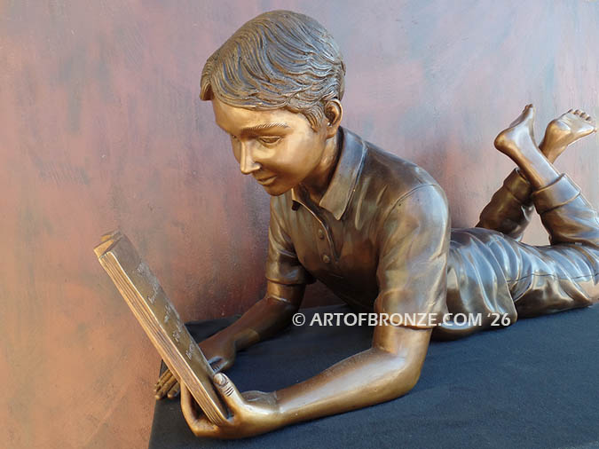 Call Art of Bronze today at (805) 908-5355 to learn more about our- outdoor bronze children’s statues – Norman Rockwell scene boy reading book bronze statue – life-size boy lying down studying bronze statue- outdoor children reading sculptures – bronze children artwork.