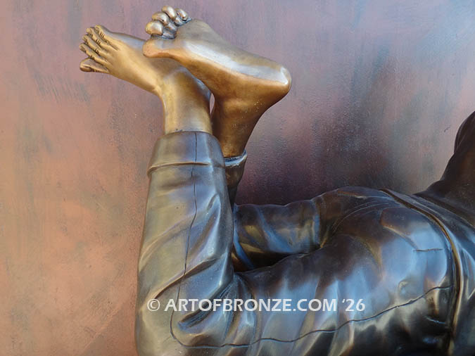 Art of Bronze is proud to offer this bronze sculpture of a young boy lying down enthralled in his favorite novel. He is the perfect inspiration for children reading. Incredible detailing can be found in his hair, clothes, fingers and toes. Enjoy this smaller version which measures 27″ in length either inside or outside your home.