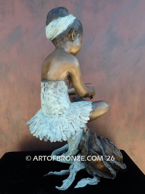 Radiating with joy, charm, and wonder, this exceptional bronze statue captures a mesmerizing moment in time—a young ballerina seated next to an extravagant rose as she delicately ties her shoe in preparation for her recital.