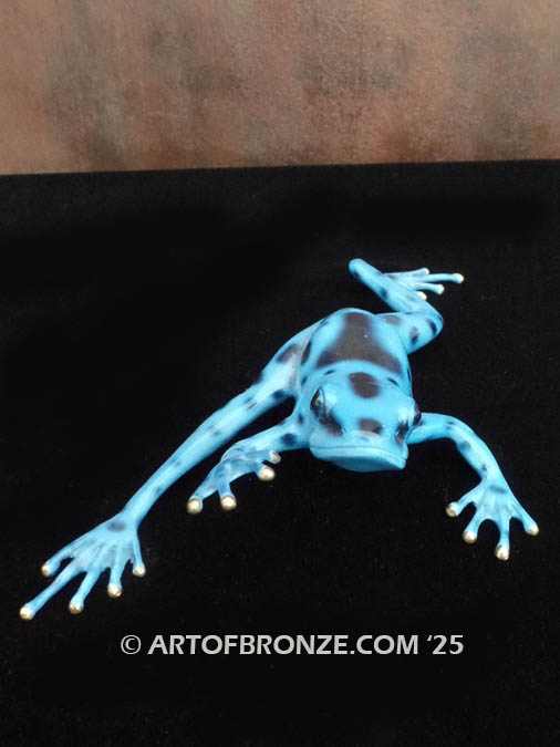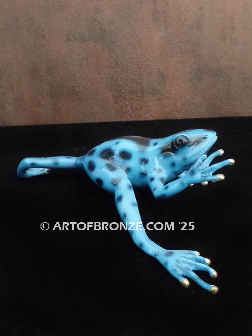 Art of Bronze proudly offers this delightful bronze sculpture of a blue poison dart frog, beautifully hand-finished in vibrant blue with bold black markings.  Captured mid-step, the frog appears to be walking forward with its right arm raised playfully upward, giving it a lively, almost whimsical personality.