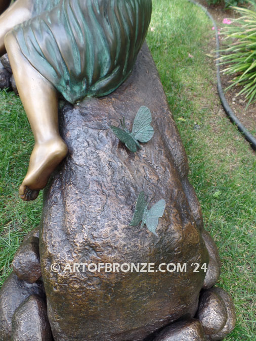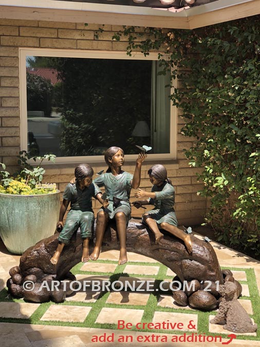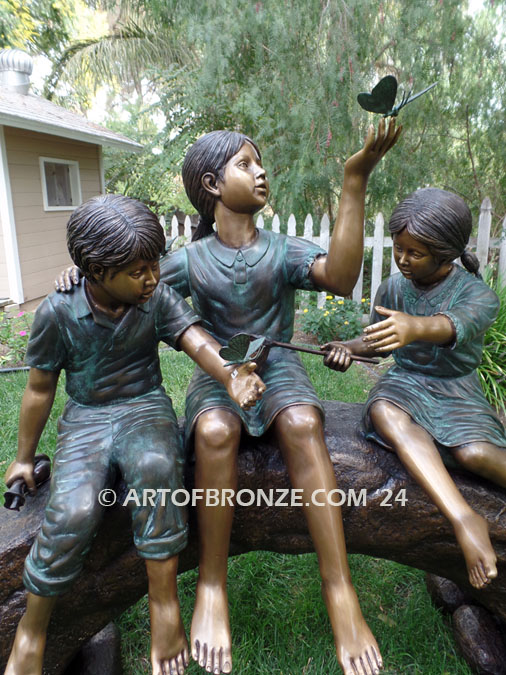 Art of Bronze proudly presents this centerpiece bronze statue that captures three children sitting upon a log sharing an enchanting adventure amidst the company of butterflies. This masterpiece brings to life the innocence of childhood friendships and the wonders that nature has to offer. The children are imbued with curiosity as whimsical butterflies dance around them.