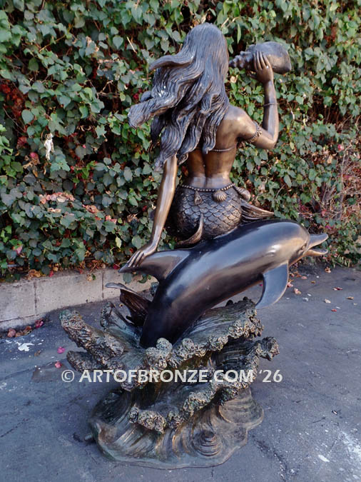 Meticulously crafted using the traditional lost wax casting method, this sculpture showcases exceptional detail throughout. Intricate texturing can be seen in the flowing strands of the mermaid’s hair, the carefully sculpted scales of her tail, and the refined shell accents that adorn her figure. The dolphin beneath her is rendered with smooth, lifelike contours that convey fluid movement through the water.