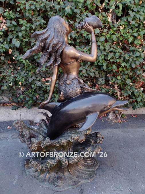 Art of Bronze is proud to present this enchanting bronze mermaid riding dolphin sculpture, a mythological composition that captures the timeless allure of ocean folklore and the beauty of marine life. Gracefully posed atop a leaping dolphin, the mermaid lifts a seashell horn as if sounding a call across the sea, creating a sense of motion, elegance, and storytelling within the sculpture.