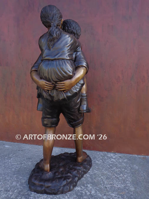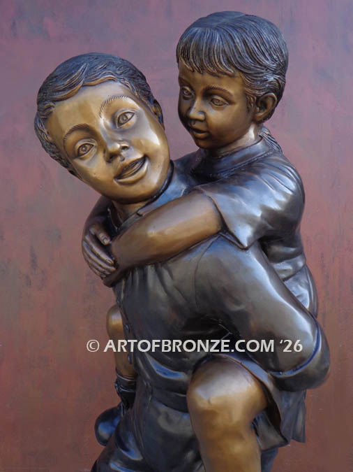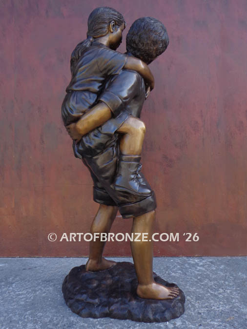 Art of Bronze proudly presents this heartwarming piggyback bronze statue of a young boy carrying a girl on his back symbolizing support, trust and willingness to go the extra mile for those we hold dear.