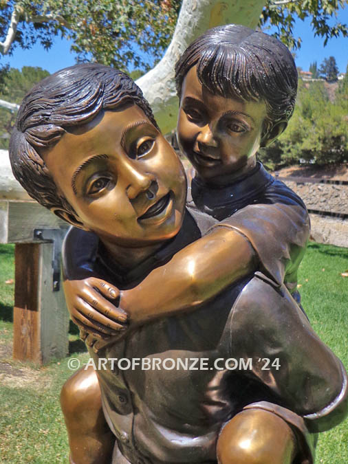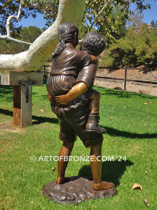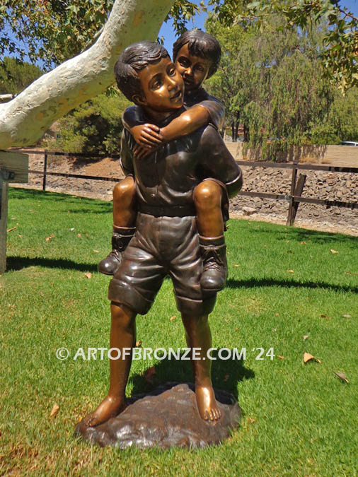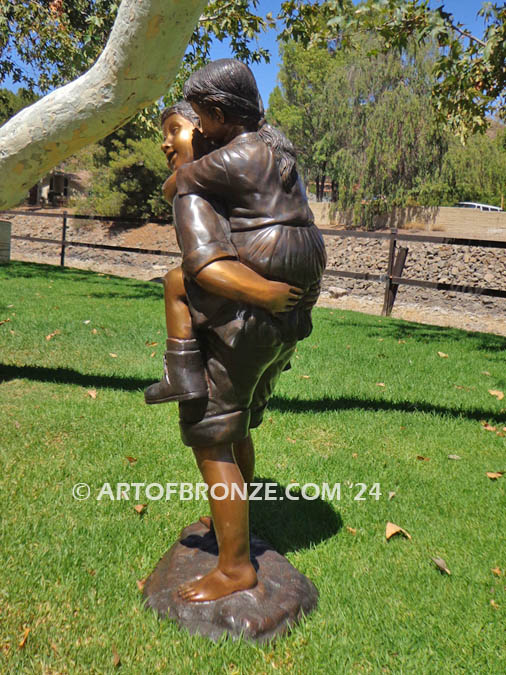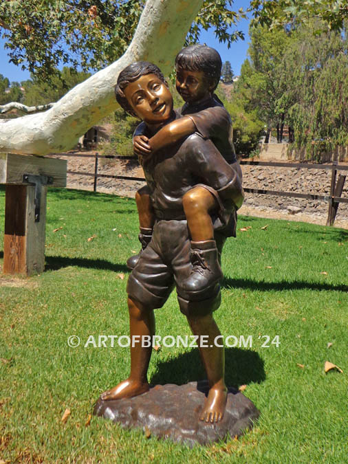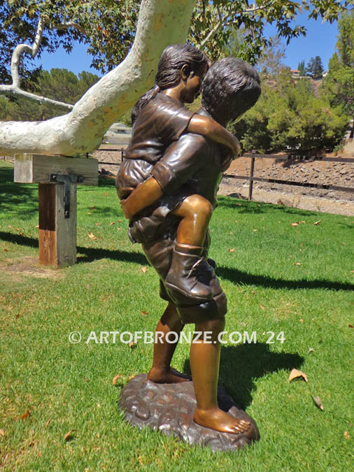 Art of Bronze proudly presents this heartwarming piggyback bronze statue of a young boy carrying a girl on his back symbolizing support, trust and willingness to go the extra mile for those we hold dear.