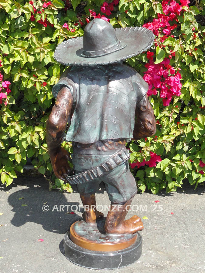 This bronze chimpanzee statue possesses a rugged, outlaw attitude.  He will add a special touch of amusement to any western art lover’s collection.  Viewers will appreciate his finely sculpted sombrero, shirt, shorts and bullet belt.  This outlaw better be careful because this bullet belt doesn’t come with a gun.  His height of 32” makes him a great sculpture to enjoy inside or outside your home.