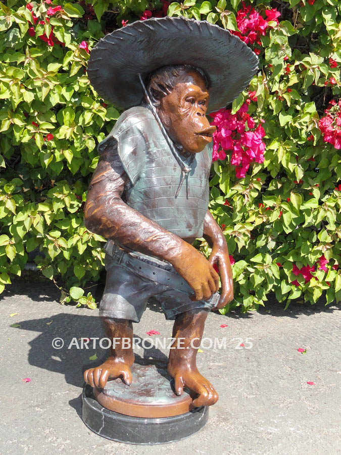 Call Art of Bronze today at (805) 908-5355 to learn more about our- whimsical chimpanzee and monkey sculptures – bronze chimpanzee cowboy– bronze monkey sculpture – bronze chimpanzee statue – statue of outlaw chimpanzee bandit – Western whimsical monkey cowboy artwork.