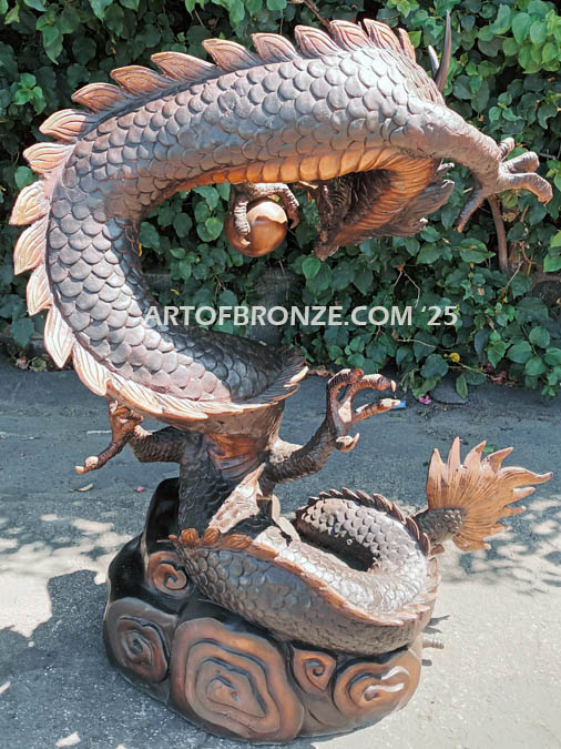 Art of Bronze is pleased to offer these two exquisitely crafted bronze Chinese dragon sculptures. Each Chinese dragon features snakelike bodies with four legs. Each dragon grasps a pearl, known as the wish-fulfilling jewel, in the four claws of one hand. They are finished in a classical brown and dark brown patina coloring. Each dragon available for individual purchase.