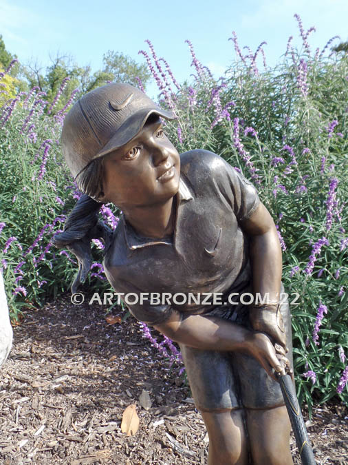 Call Art of Bronze today at (805) 908-5355 to learn more about our- outdoor bronze children’s statues – golfer girl chipping golf ball bronze statue – kids playing sports bronze statues – outdoor children golf sculptures – putting, chipping and swinging golf related children and kid bronze artwork.