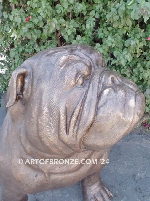 Introducing our majestic bulldog bronze statue, a stunning masterpiece that commands attention with its impressive 4 ft. length. This regal bulldog captivates onlookers with a raised and slightly turned head, sporting an inquisitive expression that adds a touch of charm.