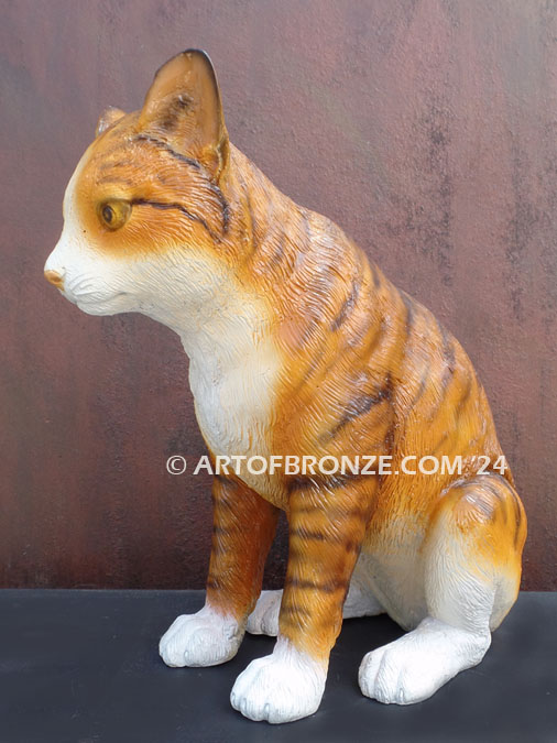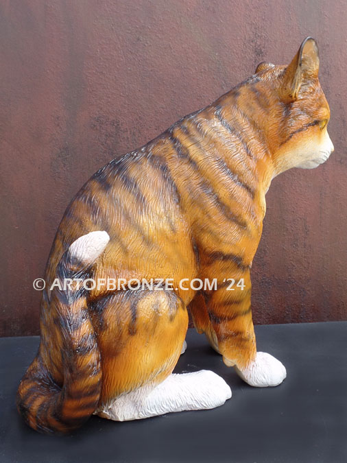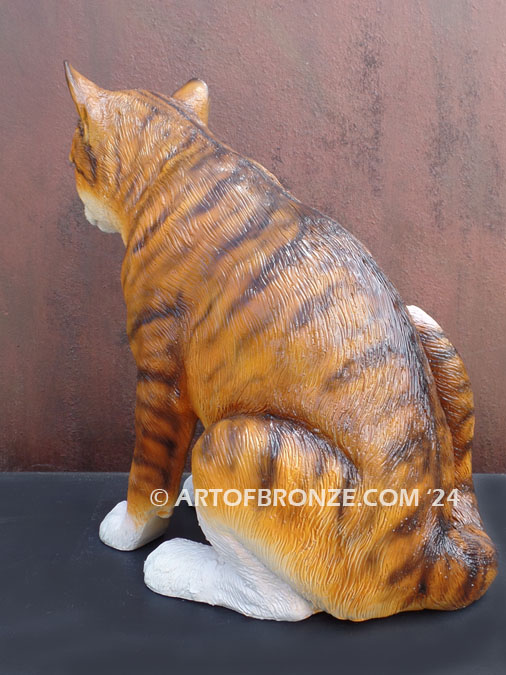 Finished in a warm and lifelike calico patina, the sculpture features rich blends of orange, black, and white, thoughtfully applied to enhance the sculpted fur texture and natural contours of the form. The hand-applied patina brings depth and character to the bronze, giving the piece a welcoming and expressive presence.