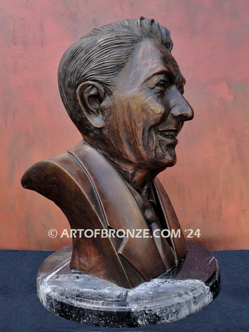 This exceptional bronze bust captures the warmth, strength, and unmistakable character of Ronald Reagan, the 40th President of the United States. Sculpted with remarkable accuracy and sensitivity, the likeness reflects both his statesmanlike presence and approachable humanity.