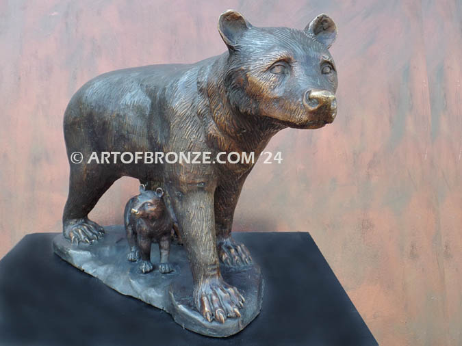 Art of Bronze proudly presents this heartwarming bronze sculpture of a mother bear and her cub, a timeless tribute to maternal love in the wild. The mama bear stands firmly on all fours, exuding strength and grace, while her curious cub nestles safely beneath her belly, gazing off into the distance. Every detail — from the textured fur to the lifelike expressions — has been masterfully sculpted and hand-finished to capture the spirit of nature’s gentle guardians.