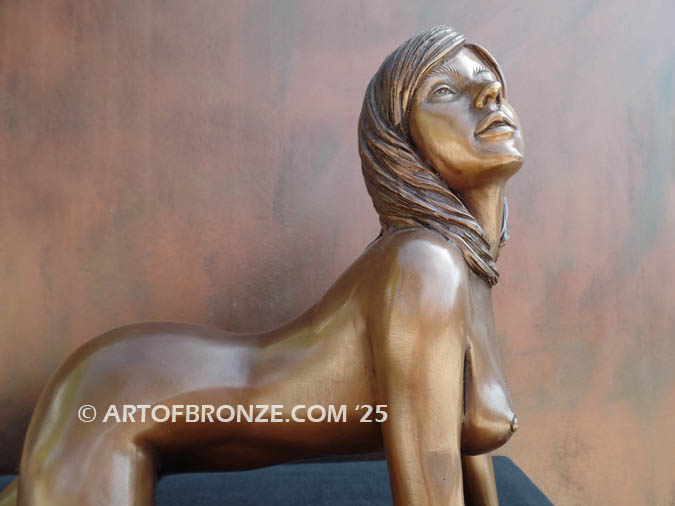 The figure is posed on her hands and knees, her head lifted in a serene, almost dreamy expression. The sculptor captures a perfect balance of poise and allure, with subtle anatomical refinement and clean, modern lines that bring the sculpture to life. Her hair falls naturally along her shoulders, framing a calm and captivating face that adds emotional depth to the composition.