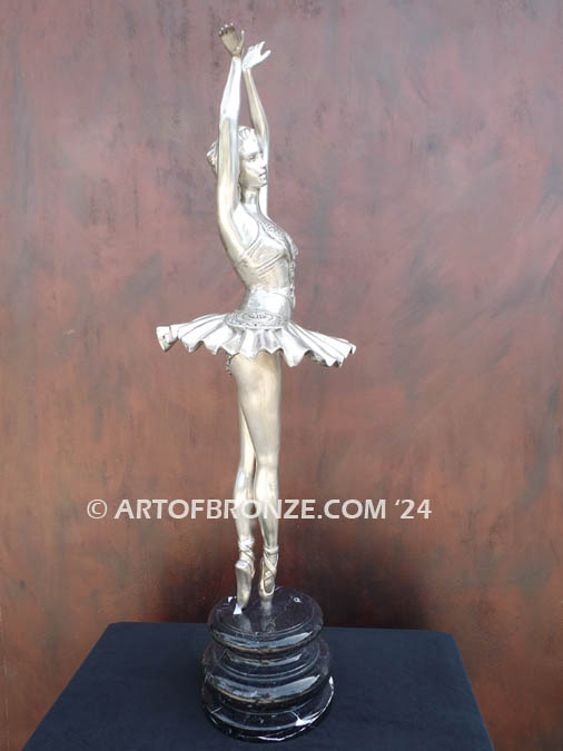 Art of Bronze proudly presents this graceful bronze sculpture of a female ballet dancer, an exquisite celebration of movement, balance, and poise. Captured in a moment of effortless elegance, the dancer tilts her head upward in quiet confidence, her arms arched gracefully above her head as she balances on the toes of both feet.