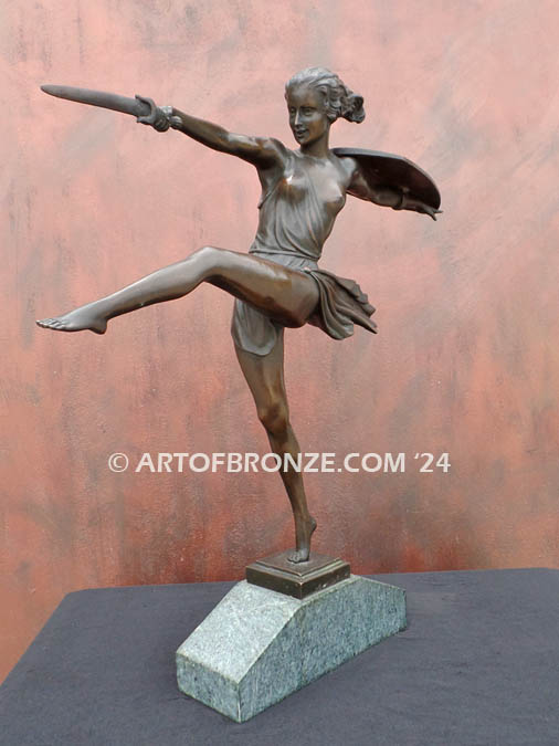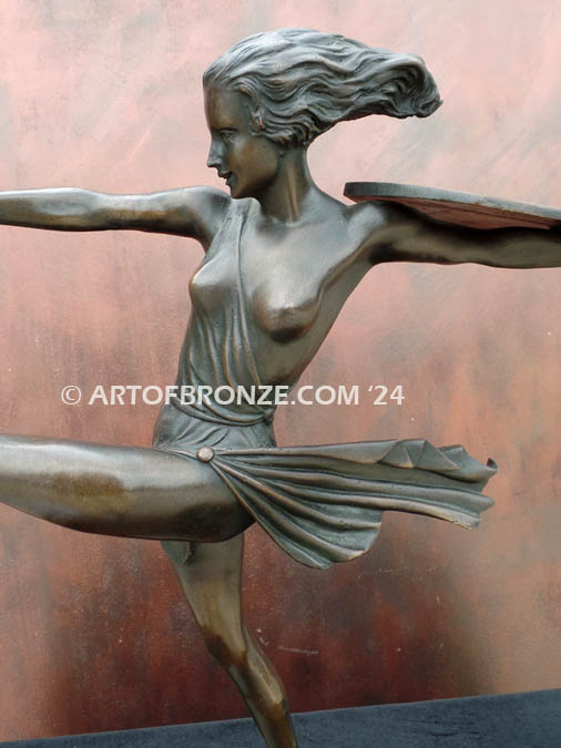Cast in bronze using the traditional lost-wax process, the sculpture exhibits exceptional detail—from the tension in her outstretched leg to the subtle contours of the draped fabric. The rich bronze patina adds depth and warmth, enhancing the sculpture’s sculptural elegance and classical presence.