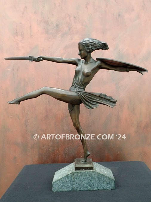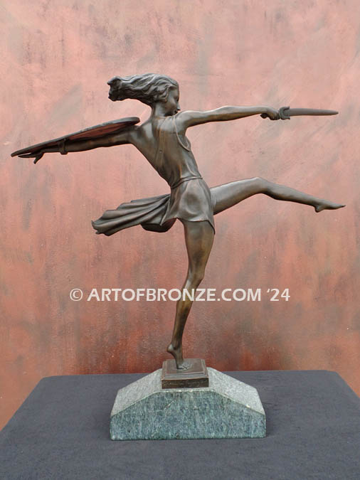 This striking artwork depicts a graceful woman in mid-stride, her body extended in a powerful, dance-like motion as she holds a sword and shield with dramatic poise.  Her wind-swept hair, elegantly sculpted drapery, and elongated limbs create a sense of fluidity, strength, and forward momentum, hallmarks of Le Faguays’ iconic style.