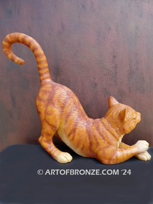 Art of Bronze proudly offers this delightful bronze cat sculpture, captured in a playful stretch with her body resting low to the ground, her hindquarters raised, and her tail standing upright in cheerful anticipation.