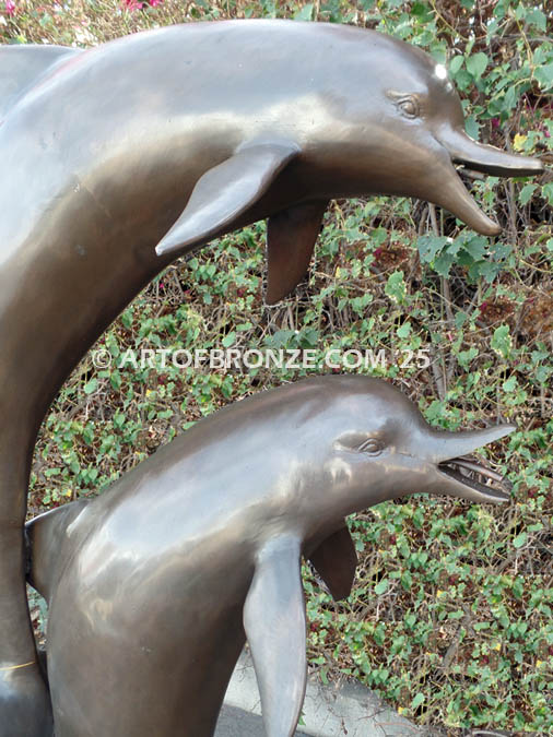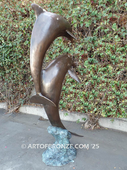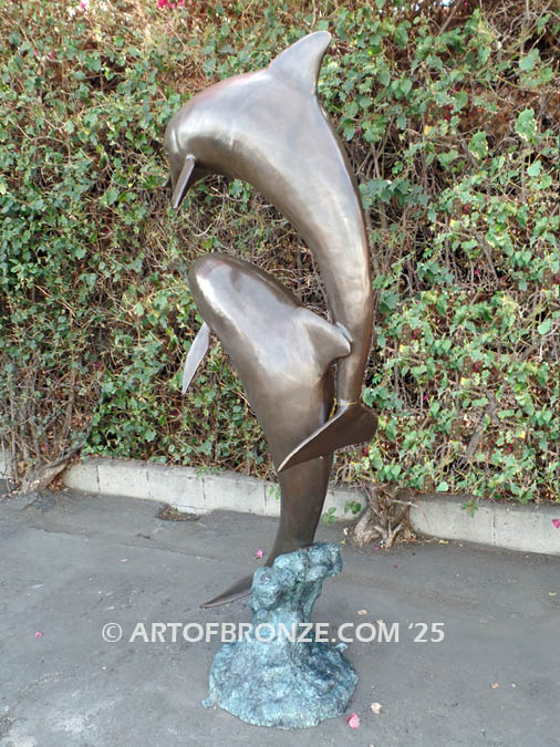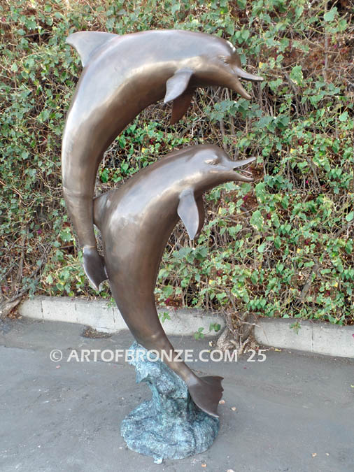 Custom outdoor bronze artwork of two playing dolphins! Jumping dolphin waterfall fountain. Dolphin, whale and porpoise bronze fountain sculptures.
