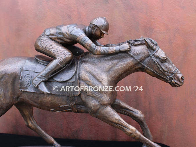 Art of Bronze is pleased to present the power and athleticism of the thoroughbred racehorse and jockey in this equestrian bronze sculpture entitled “Down the Stretch.” This statue captures the unity of jockey and horse at full gallop in pursuit of victory. The thoroughbred is balanced with two back legs attached to the bronze base and two front legs extended in motion through the air. This statue is hand chased with fine detail and finished in a rich patina coloring. This horse racing statue is perfect for the ‘Sport of Kings’ fan.
