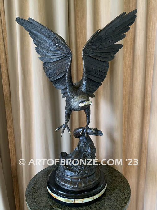 Art of Bronze invites you to own this bronze eagle masterpiece after superb late 19th century artist Jules Moigniez.  The bald eagle has just landed on a branch with beautifully detailed outstretched wings.  This version features a polished beak and talons with a traditional brown patina coloring.  This eagle is a great centerpiece for your office or home that will accent any décor.