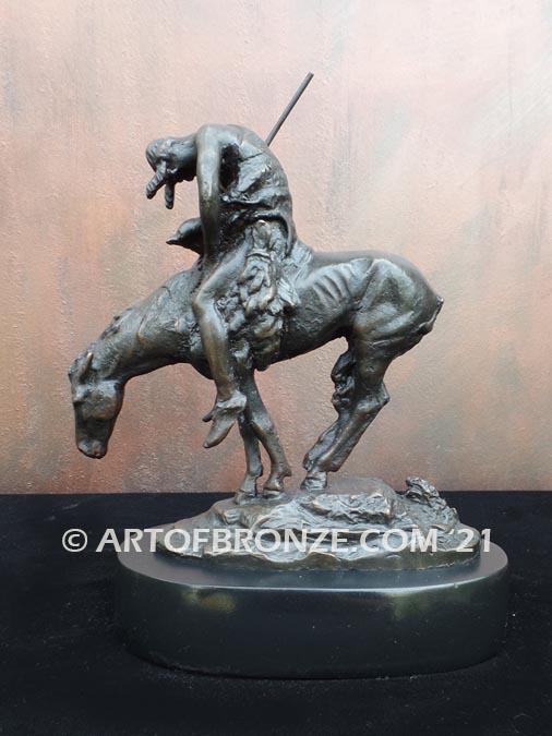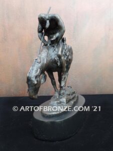Art of Bronze is proud to offer “The End of the Trail” (9.25” H.) bronze sculpture after James Earle Fraser. This scaled down statue vividly portrays a weary Native American man, draped in the remnants of a blanket, clutching a spear. Limp and fatigued, he is accompanied by his exhausted horse with swollen eyes. The wind tousles the horse’s tail, indicating they face away from the relentless elements.