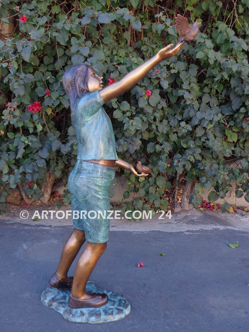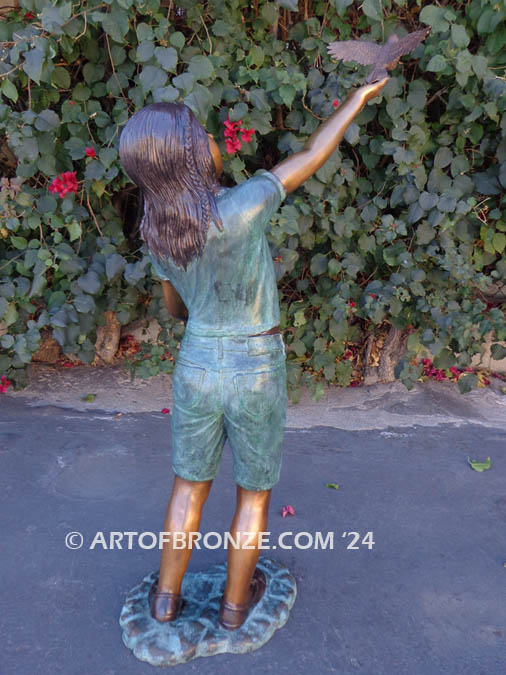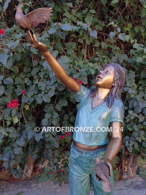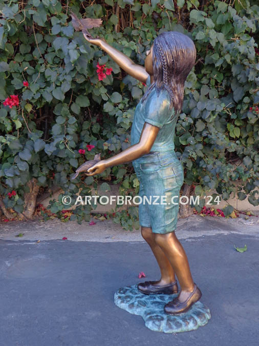 This beautiful bronze sculpture captures a moment of serene and symbolic beauty with a young girl releasing a dove with one hand while cradling another dove in her gentle embrace. The scene is a poignant reflection of tranquility, connection, and the timeless symbolism of doves as spirit messengers and carriers of peace.