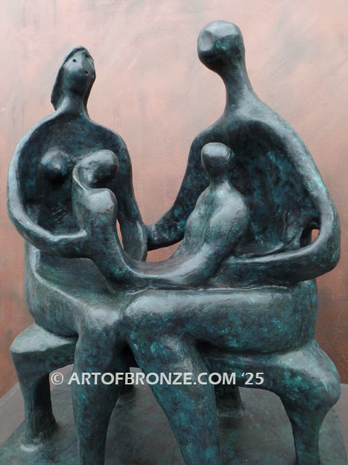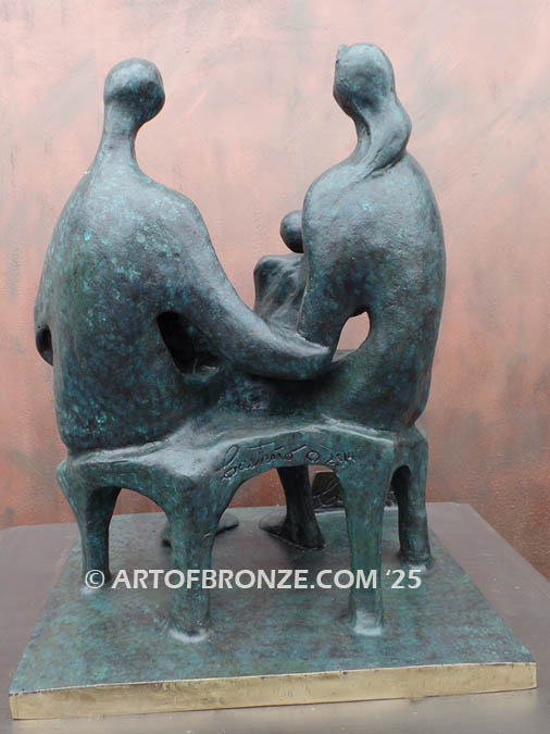 The simplified, elongated forms of the figures create a powerful sense of harmony and balance. Their gently interlocking poses convey warmth and protection, while the rich blue-green patina highlights the textured surface and adds depth to the sculptural composition. The minimalist faces and fluid silhouettes evoke Moore’s timeless exploration of the human form and its emotional resonance.