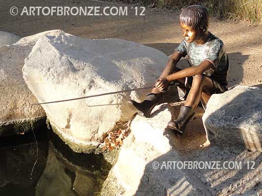Art of Bronze is pleased to present this handsome bronze sculpture of a young boy with fishing pole in his hand. The timeless joy of fishing is forever captured with this boy sitting patiently waiting for a tug on his line.