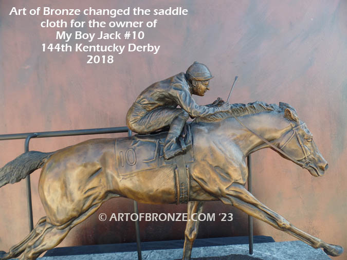 This Art of Bronze exclusive can be personalized with your custom racing number and silk colors, creating a one-of-a-kind tribute to your favorite horse or memorable race. The version shown features custom #10 silks for the 144th Kentucky Derby contender “My Boy Jack.”
