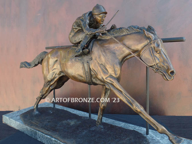 Every nuance is expertly rendered — from the jockey’s silks, helmet, goggles, and whip to the precise anatomy and motion of the galloping horse, suspended mid-stride with two legs lifted powerfully off the ground. The artistry of the lost-wax casting process and the hand-applied patina give the sculpture remarkable realism and vitality, making it a true statement piece for any home, office, or equestrian enthusiast.