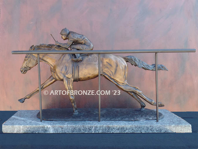 Art of Bronze proudly presents this exhilarating bronze horse racing sculpture, capturing the speed, power, and elegance of a jockey and his thoroughbred in full stride. Sculpted with incredible attention to detail, the rider leans forward with focus and determination as his horse charges down the track, the side rail sweeping past in a blur of motion.