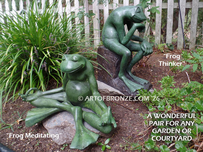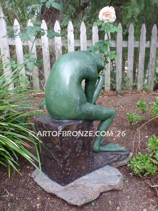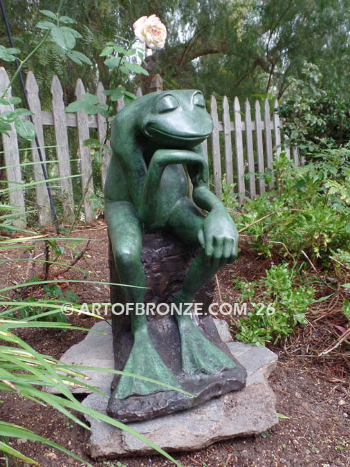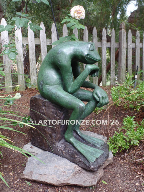 Call Art of Bronze today at (805) 908-5355 to learn more about our whimsical amphibian and frog bronze sculptures – bronze frog thinker statue – green frog & tree bronze statue – bronze frog sculpture artwork – outdoor garden thinking frog.