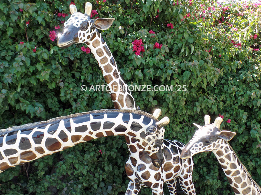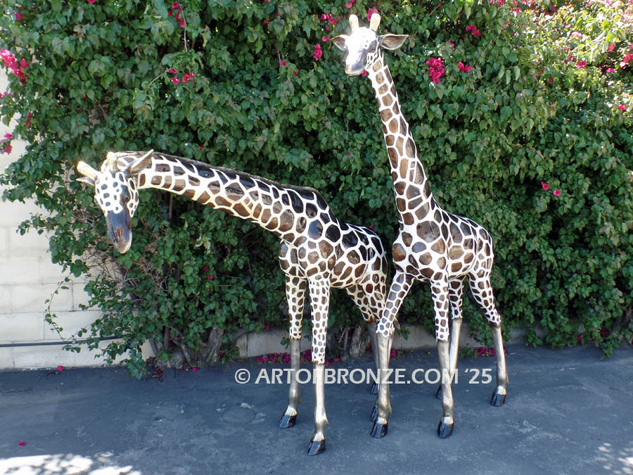 Stainless steel mounting brackets can be welded under their hooves so each giraffe can be permanently secured.  Each Sculpture is cast in the ‘lost wax’ process and hand finished in a custom multi polychrome.  A traditional brown on brown patina is also available.