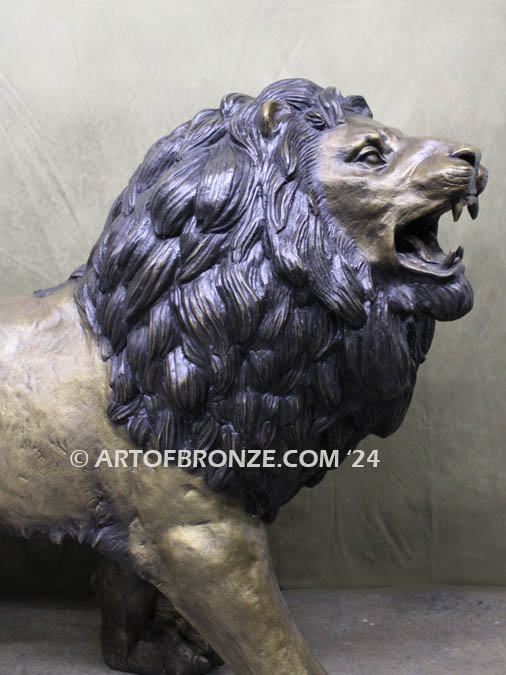 Art of Bronze proudly presents this commanding bronze statue of a roaring lion, a striking embodiment of strength and majesty. With his head raised high, the lion’s powerful roar captures a moment of untamed energy. His magnificent mane flows in detailed, lifelike textures, while his stretched body showcases expertly sculpted muscles that emphasize his might and grace.