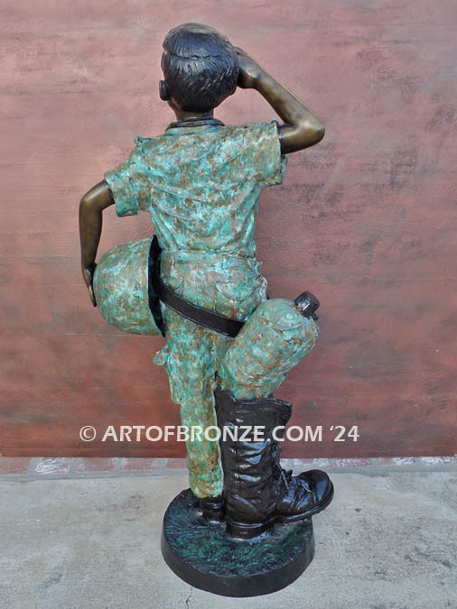 The sculpture intricately details the young boy clad in his father’s gear; one foot proudly adorned with his large boot, while his full-size helmet his held under his left arm. Some of his other gear includes binoculars hanging gracefully around his neck and a water canteen dangling from his belt.