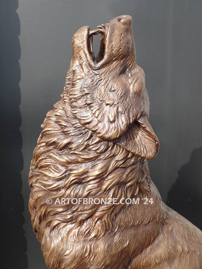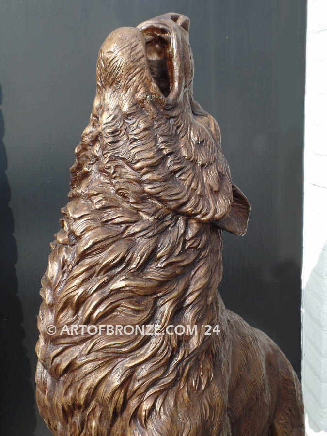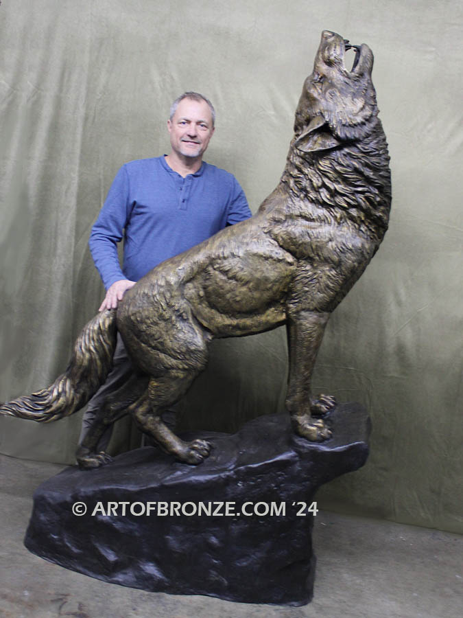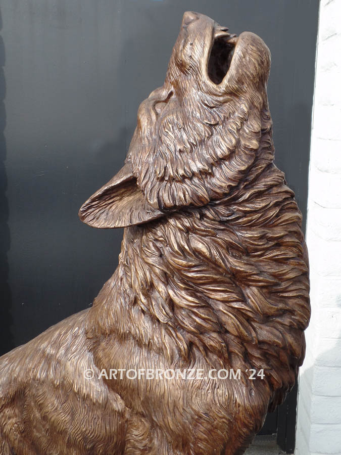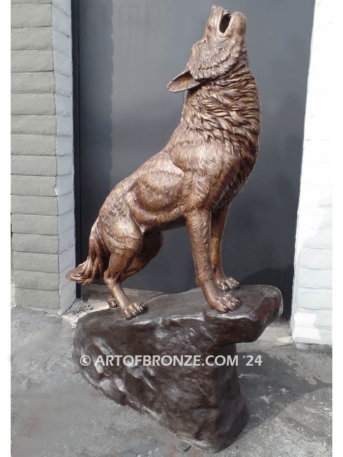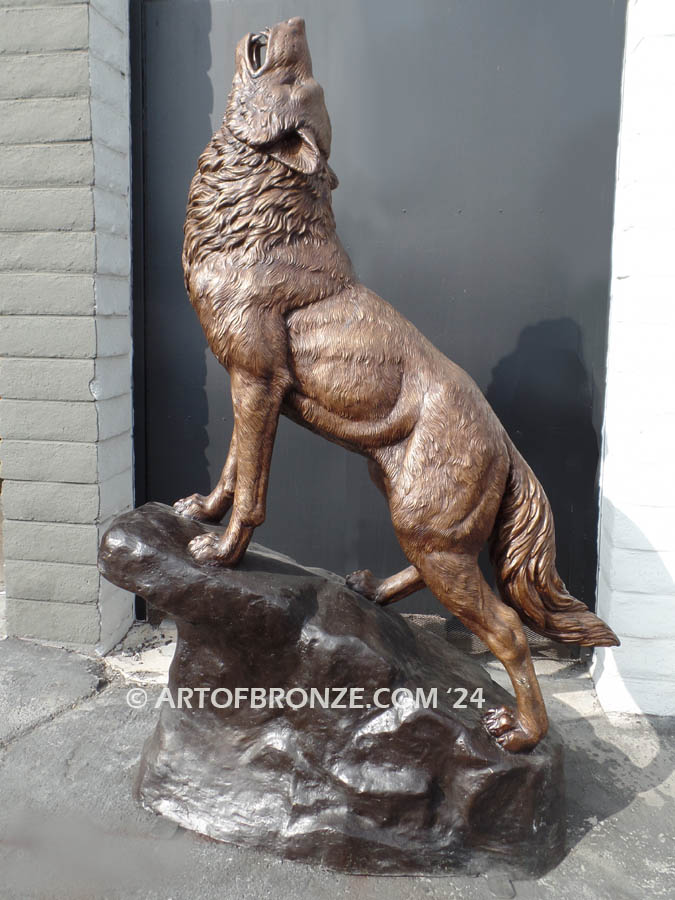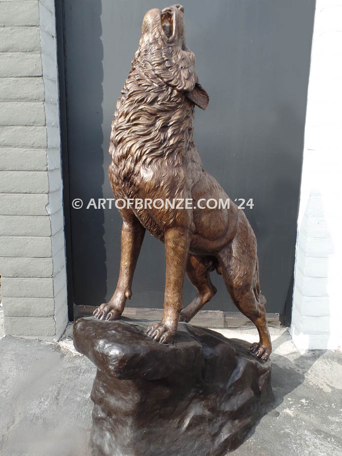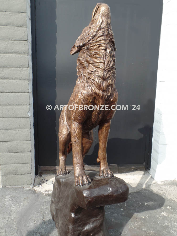 Art of Bronze proudly presents this commanding monumental bronze howling wolf statue, a powerful statement piece that embodies strength, loyalty, and the untamed spirit of the wild. Standing an impressive 7 feet tall, this striking wolf lifts his head toward the night sky, frozen in a timeless howl that symbolizes protection and presence across your property.