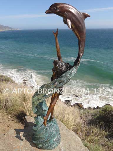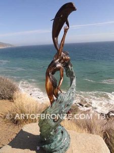 Call Art of Bronze today at (805) 908-5355 to learn more about our- outdoor fantasy bronze statues – bronze art nouveau female sculpture – outdoor woman with dolphin statue and lady playing with bronze dolphin statue.