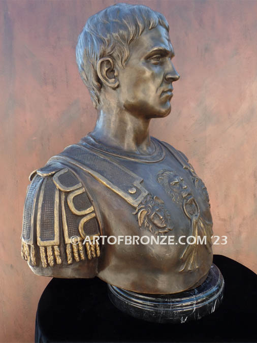 Nearly life-size in scale, the bust features intricately sculpted bas-relief armor, capturing classical motifs with remarkable depth and authenticity. The expressive facial structure, determined gaze, and refined contours bring Caesar’s likeness to life with dignity and strength.