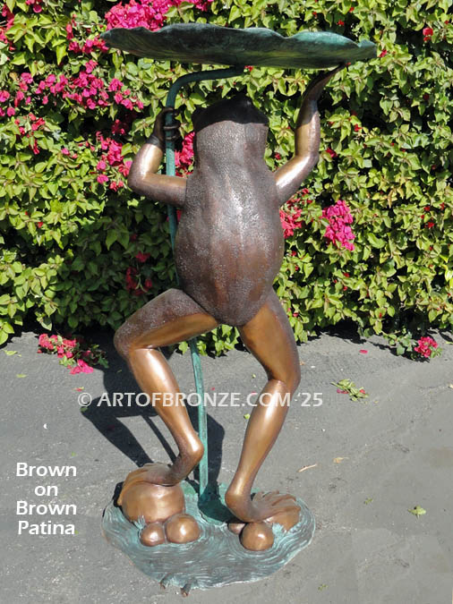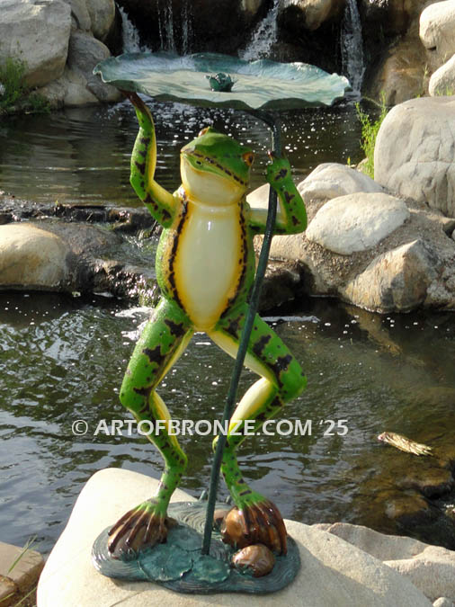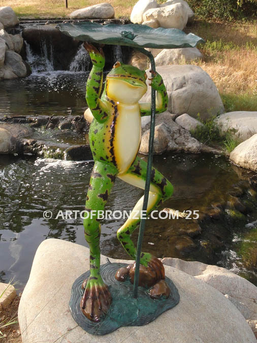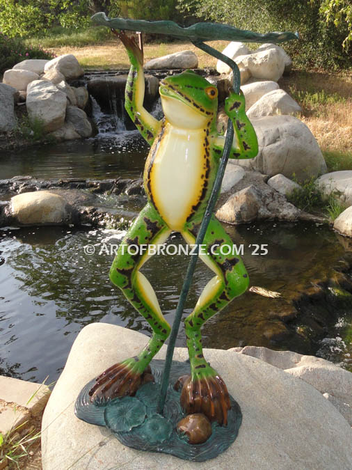 Art of Bronze is delighted to present this enchanting bronze frog fountain statue, a whimsical work of art that brings charm, imagination, and playful elegance to any setting. This slender bullfrog stands upright on his hind legs, cleverly holding a tall stem in one hand while balancing a large leaf above his head, as if seeking shelter from a gentle rain. The delightful pose captures personality and storytelling, making this sculpture a memorable focal point for any garden or patio.