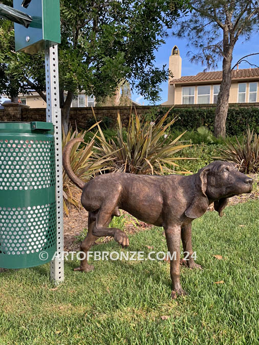 Introducing our playful and whimsical bronze statue from Art of Bronze, featuring a charming depiction of a dog lifting his leg to pee. Crafted with attention to detail, this lifelike sculpture captures the canine’s playful posture, standing on three legs with one raised high in the air.