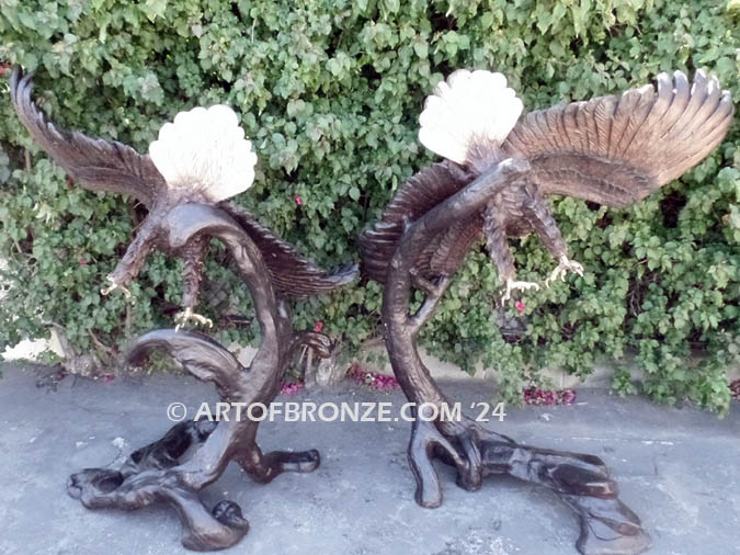 Art of Bronze proudly presents this commanding right- and left-facing pair of larger-than-life bronze bald eagle sculptures, captured in dramatic downward swoops toward their intended targets. Designed as a complementary set, the two eagles create a powerful visual dialogue that conveys motion, strength, and precision—bringing the majesty of the bald eagle vividly to life.