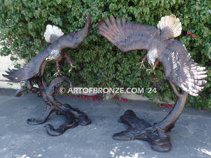 Each eagle features fully outstretched wings with exceptional detailing throughout every layered feather, paired with formidable talons extended forward with purpose and intensity. The dynamic forms are artfully supported by gracefully curved bronze branch structures, providing natural realism, balance, and sculptural elegance to the overall composition.