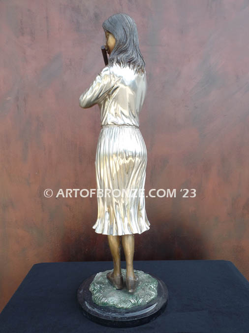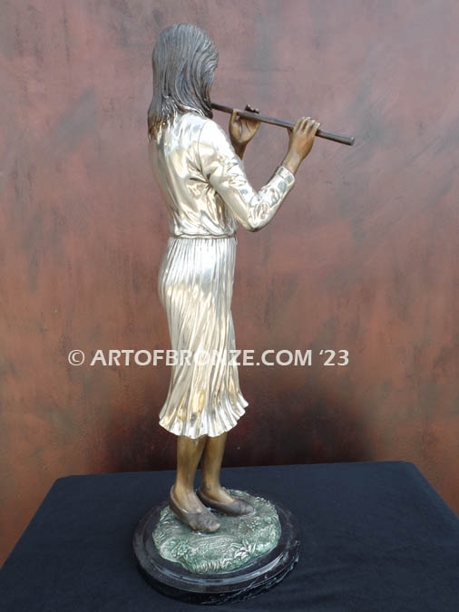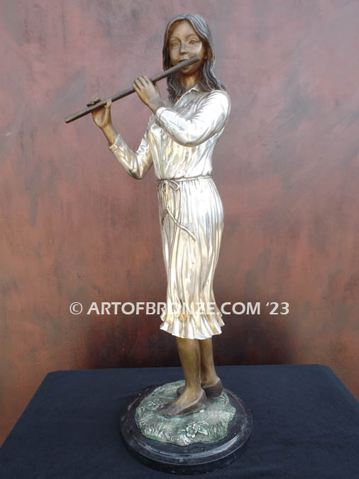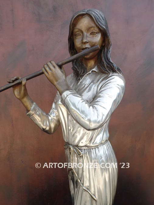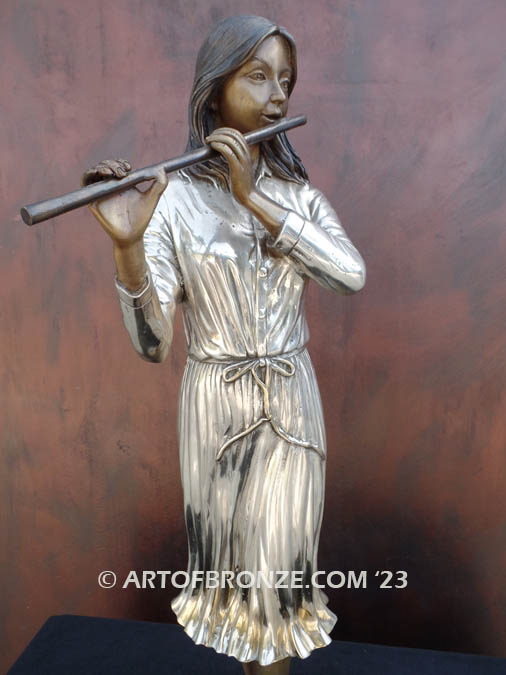 Art of Bronze is pleased to present this harmonious bronze sculpture of a woman playing her flute, a beautifully expressive work of art that captures the grace and emotion of musical performance. The figure stands poised in a flowing dress that is finished in a beautiful silver color. Her posture conveying both strength and delicacy as she blows into her flute.