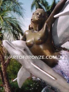 • Neptunes Delight Bronze sculpture of mermaid swimming with dolphins for pool or water feature